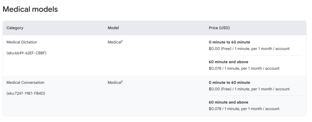 Google speech-to-text includes 60 free minutes monthly. Standard pricing is $0.006 per 15 seconds ($1.44/hour) for minutes 60-1 million. Enhanced models cost $0.009 per 15 seconds ($2.16/hour).