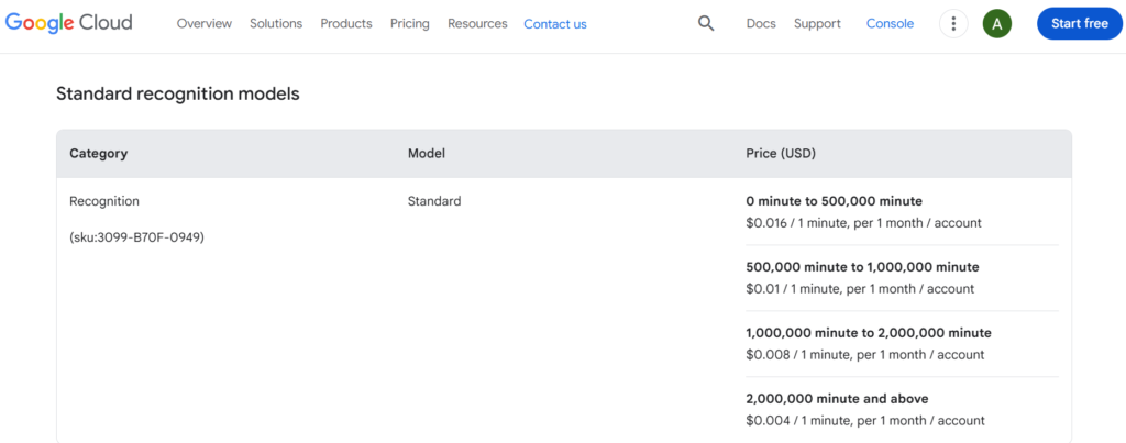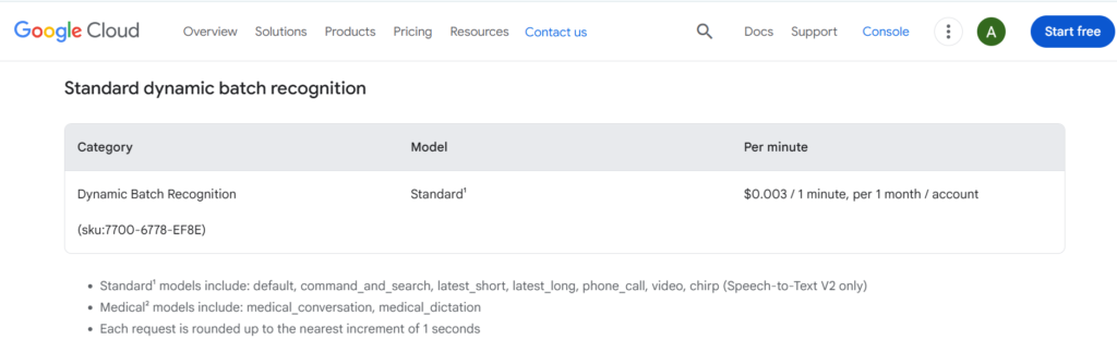 Free Tier: 60 minutes of transcription per month using standard models. Applies to all recognition types (synchronous, asynchronous, streaming).